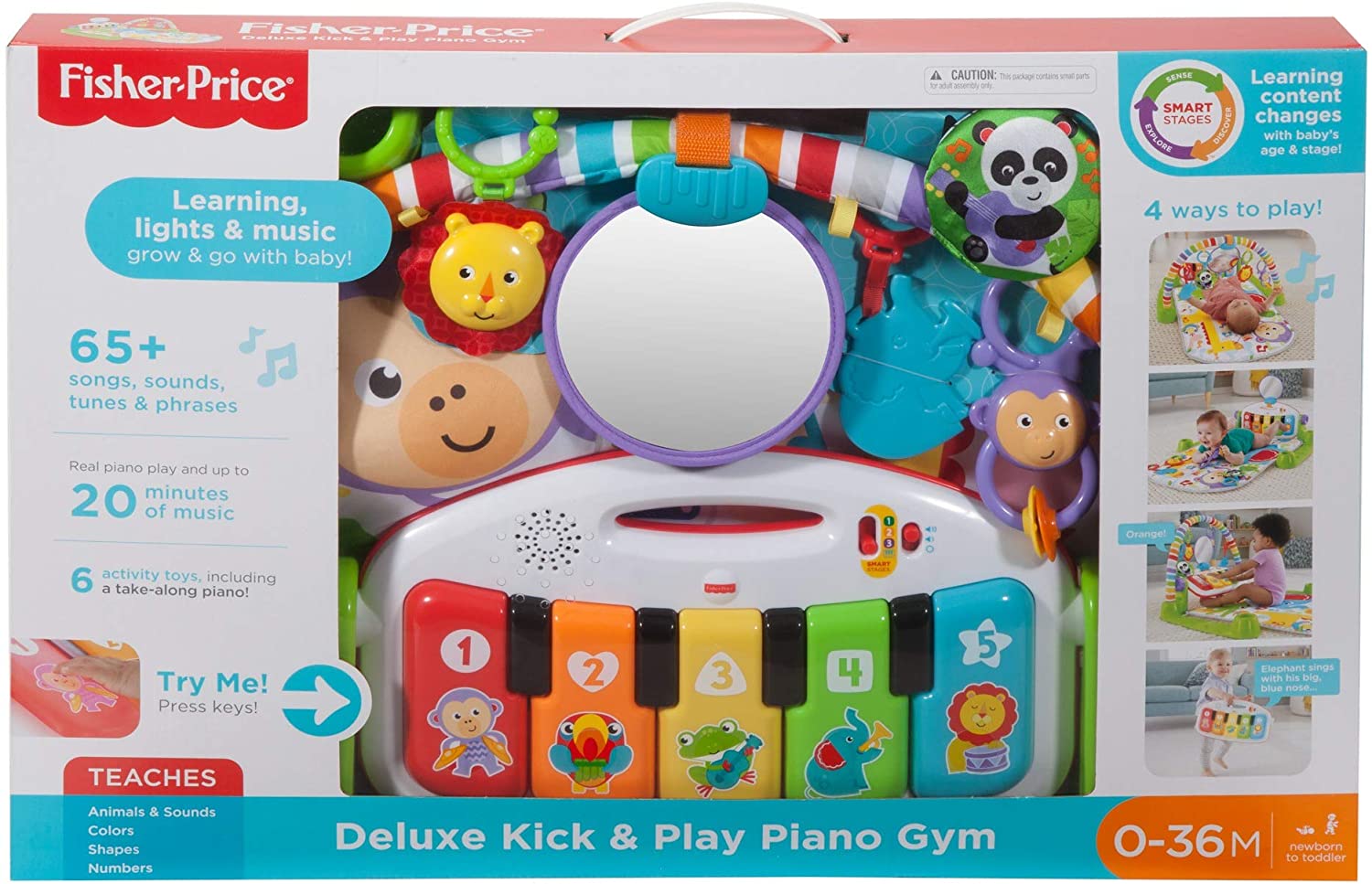 Kick play time up a notch with this deluxe gym featuring five light-up piano keys, a repositionable toy arch, and four musical settings that keep your little one rocking out for years! As your baby grows from lay and play to tummy time to sitting up at the piano, you can change up the music and learning, too! Smart Stages technology lets you change the learning content to best fit your baby's age and stage, while real piano notes encourage your little Mozart to create a tune of their own! You can even detach the keyboard for musical fun on the go!.4 ways to play - Lay & playTummy timeSit & playTake along. Learning content changes with baby's age & stage with Smart Stages technology - Sense (0 months +) - Up to 20 minutes of continuous musicDiscover (3 months +) - Short songs about animalsExplore (6 months +) - Songs & phrases introduce colors, shapes & numbers. Large keyboard with 5 light-up keys, removes for take-along play! 5 repositionable toys - self-discovery mirror, elephant teether, crinkle panda, lion rattle & monkey cymbal clackers. Super soft & thick, machine-washable play mat features loops to attach toys. Age Birth to 36 Months