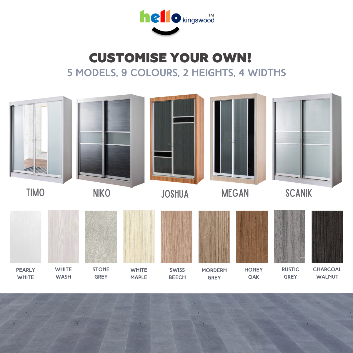 12 months manufacturer warranty Material: Solid Plywood Sturdy aluminium door frame Strong aluminium hanging bar Durable full extension drawer slides Width: 4.5, 5, 5.5, 6ft Height: 1.97m or 2.4m Depth: 60cm Models: Timo, Niko, Scanik, Megan, Joshua Available in 9 trendy colours