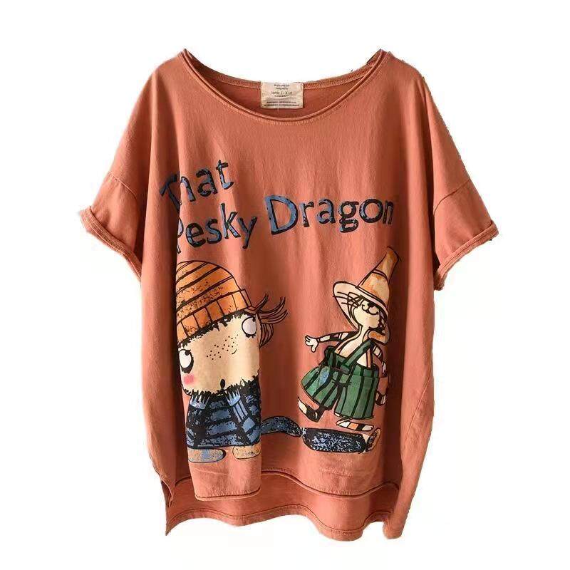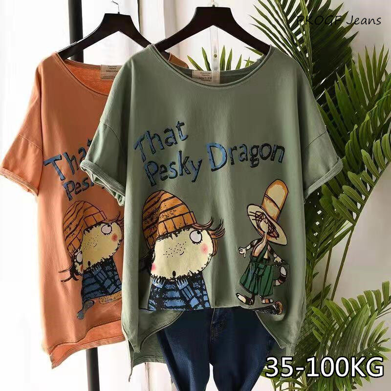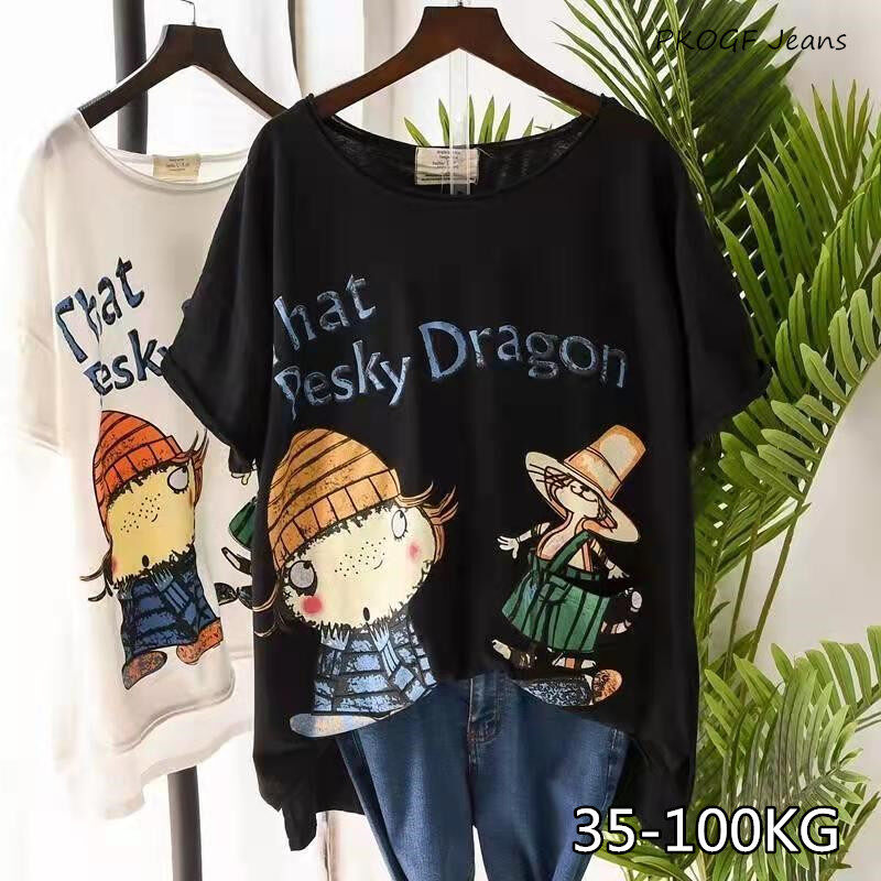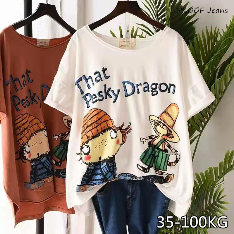 PKOGF Summer New Plus Size Women T-shirt Casual Loose Cartoon Print Pattern Over Size Short Sleeve Tops