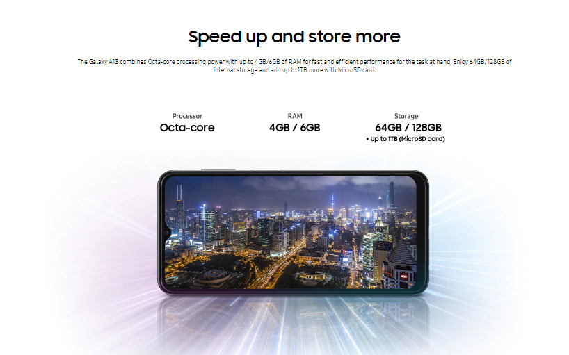 • NETWORKTechnologyGSM / HSPA / LTELAUNCHAnnounced2022, March 04StatusAvailable. Released 2022, March 23BODYDimensions165.1 x 76.4 x 8.8 mm (6.5 x 3.01 x 0.35 in)Weight195 g (6.88 oz)BuildGlass front (Gorilla Glass 5), plastic frame, plastic backSIMSingle SIM (Nano-SIM) or Dual SIM (Nano-SIM, dual stand-by)DISPLAYTypePLS LCDSize6.6 inches, 104.9 cm2 (~83.2% screen-to-body ratio)Resolution1080 x 2408 pixels, 20:9 ratio (~400 ppi density)ProtectionCorning Gorilla Glass 5PLATFORMOSAndroid 12, One UI 4.1ChipsetExynos 850 (8nm)CPUOcta-core (4x2.0 GHz Cortex-A55 & 4x2.0 GHz Cortex-A55)GPUMali-G52MEMORYCard slotmicroSDXC (dedicated slot)Internal32GB 3GB RAM, 64GB 4GB RAM, 128GB 4GB RAM, 128GB 6GB RAM