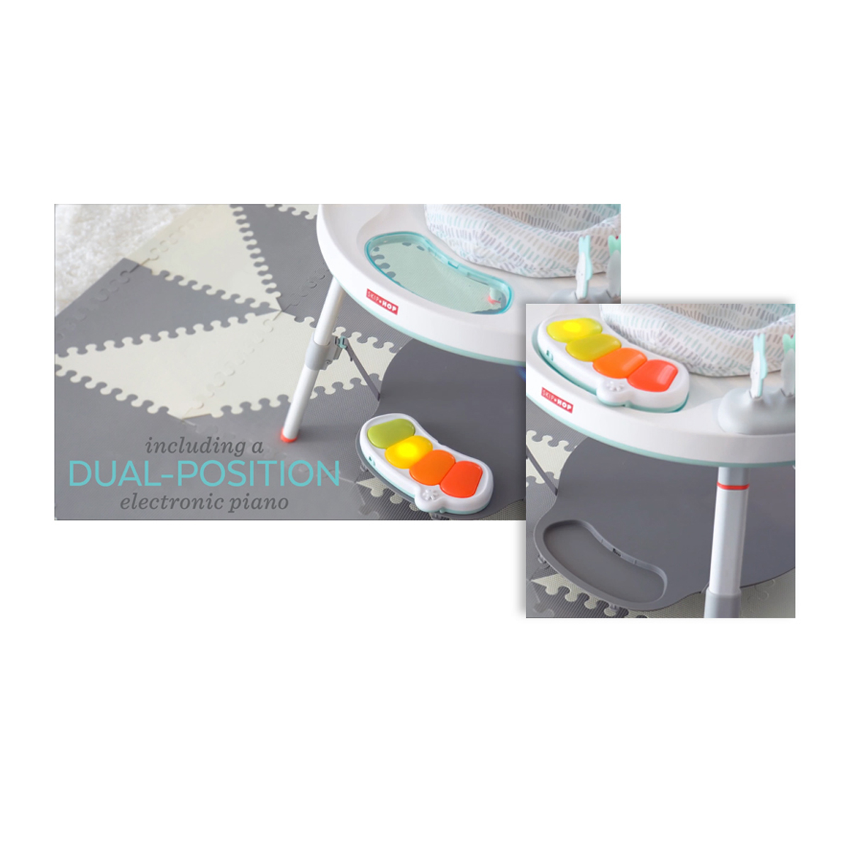 Ages 4m+Three stages of use: Sit, swivel, bounce & play; Cruise & interact; Play table25+ developmental activitiesDiscovery Window lets baby see piano and their feet while playing to learn cause and effect through spatial awarenessConverts to a play table with smooth plastic chalkboard surfaceClip-on toys can be positioned based on baby's abilitiesFour movable toys include: peekaboo clouds that pop up and squeak, wobble lamb with rattle beads, swaying stars move back and forth and sun bead mover with spinnerMusical light-up piano with three ways to play: piano mode, song mode and motion sensor modeIncludes suction bird snack bowl; dishwasher-safe360-degree rotating seat that stretches for bouncing and includes toy loops to attach toysFoot support platform adjusts to the perfect heightLegs detach for easy storageRequires three AAA batteries (not included)Phthalate-freeSize (inches): 31l x 31w x 18.5h; (cm): 79l x 79w x 47h
