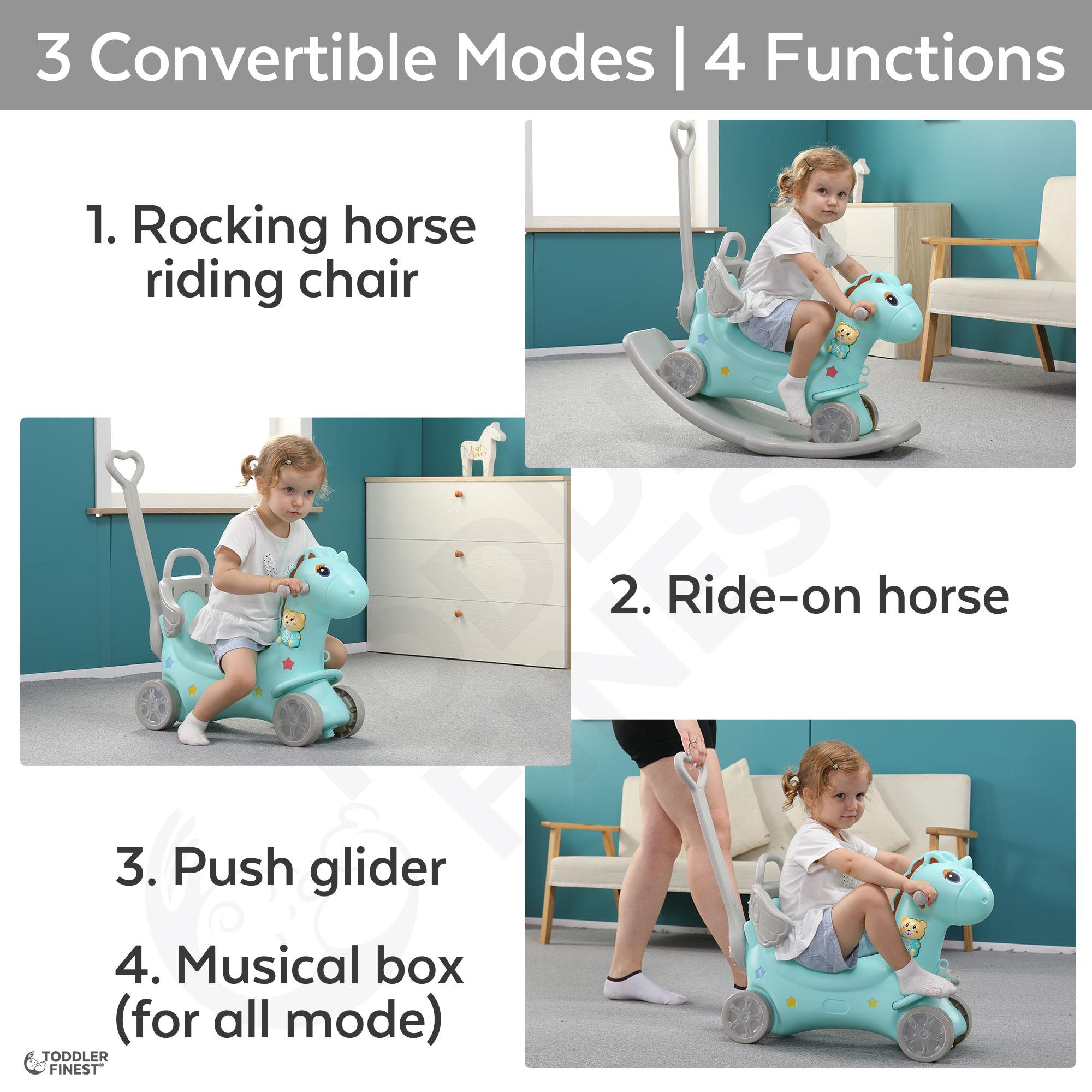 4-in-1 Rocking Horse - Push Glider Pony Rocker Toy - Musical Player Riding Chair - Ride On Rocking Animal - 1.5x Thicker Safer Durable - Anti-Slip Smart Auto Balance - For 1,2,3 year old Boy Girl Child Toddler - Outdoor Indoor Birthday Gift (ToddlerFinest)